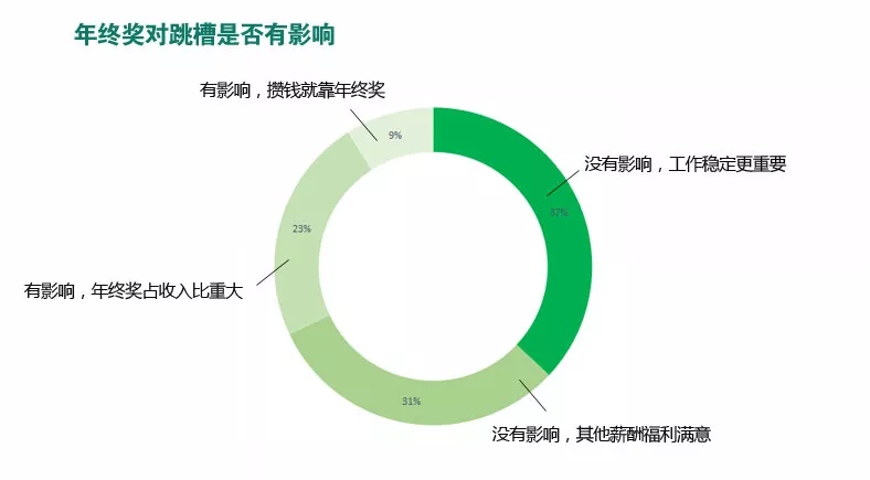 但是即便大部分人對(duì)今年的年終獎(jiǎng)的增長(zhǎng)沒(méi)有信心,卻很難讓他們因?yàn)槟杲K獎(jiǎng)而跳槽。半數(shù)以上的受訪者年終獎(jiǎng)?wù)既晔杖氲谋壤齼H為20%左右,即便不滿意年終獎(jiǎng),但工作的穩(wěn)定性、工作環(huán)境、企業(yè)福利是他們更看重的要素。只有少數(shù)受訪者表示收入依賴年終獎(jiǎng),如果年終獎(jiǎng)不滿意一定會(huì)尋找機(jī)會(huì)跳槽。因此企業(yè)在人才管理上,需要特別注意年終獎(jiǎng)對(duì)于員工保留的影響,提前做好預(yù)防工作。