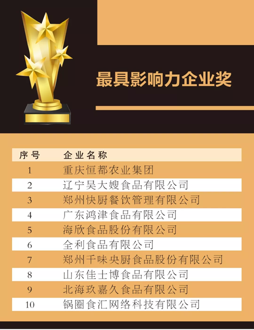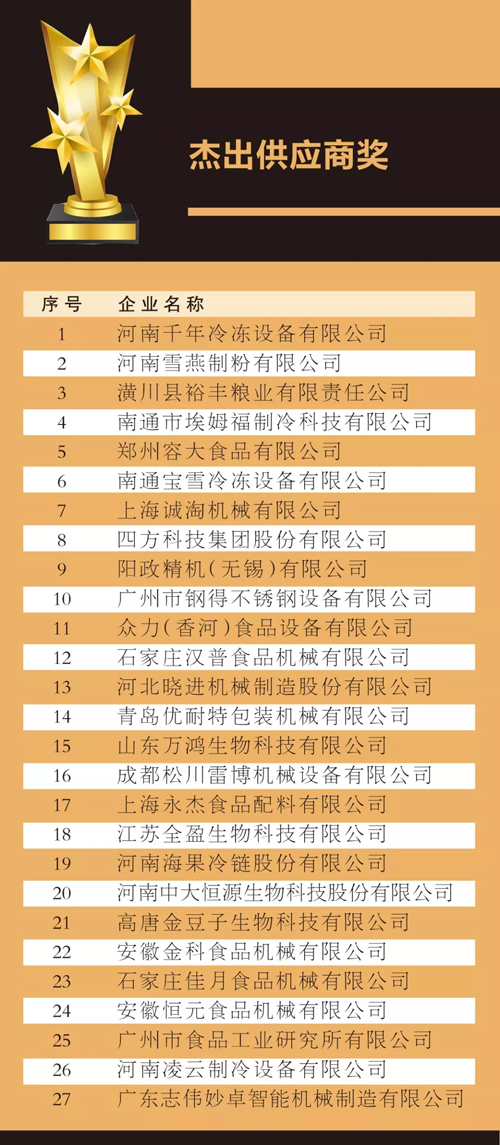 8月18日上午,在2019中國冷凍食品產業大會優秀展商頒獎典禮上,最具影響力企業獎、技術創新獎、成長新星產品獎、杰出供應商獎4大獎項名單滾燙出爐。