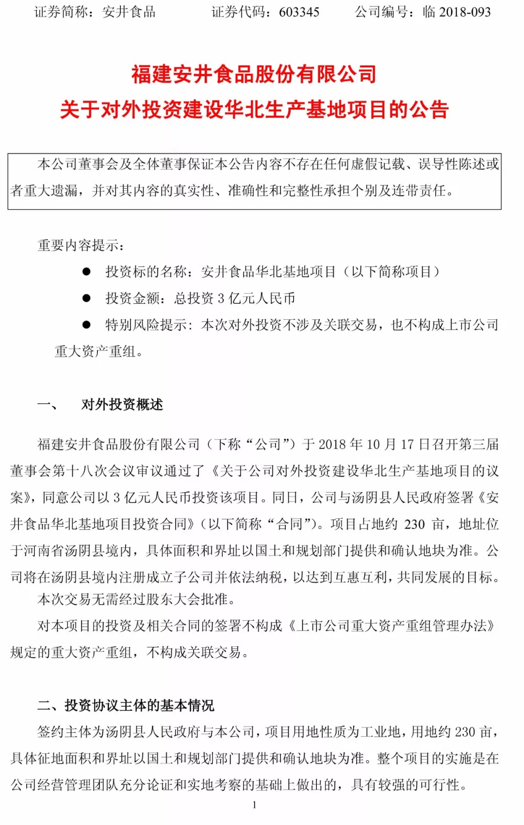10月17日,安井食品召開第三屆董事會第十八次會議,審議通過了《關于公司對外投資建設華北生產基地項目的議案》,同意公司以3億元人民幣投資該項目。同日,公司與湯陰縣人民政府簽署《安井食品華北基地項目投資合同》。