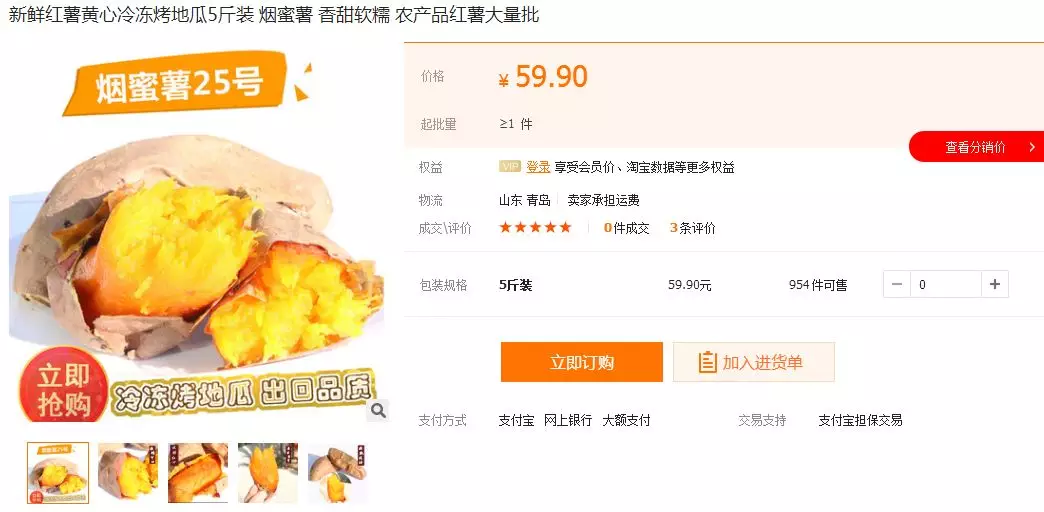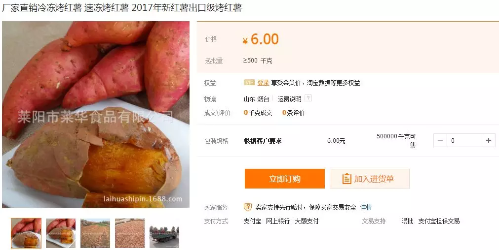 ▲萊華食品冷凍烤薯500公斤起批,阿里巴巴售價(jià)